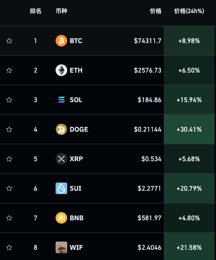 此外,多数数字货币强势走高。狗狗币涨超30%。